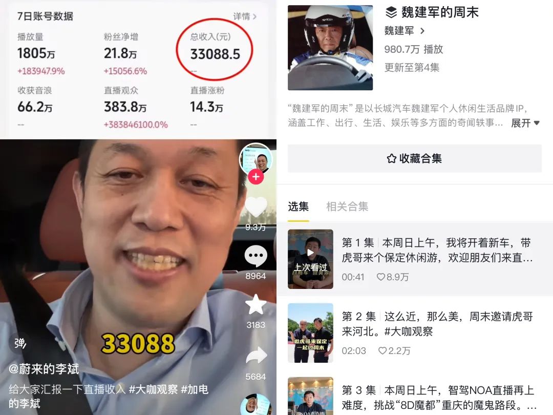 他的抖音賬號(hào)里,合集“魏建軍的周末”直接定位為魏建軍個(gè)人休閑生活品牌IP,涵蓋工作、出行、生活、娛樂等多方面的奇聞軼事。但自5月23日發(fā)布了第一條視頻獲8.9w贊后,該合集至今只更新了4集,平均點(diǎn)贊量不足2w。