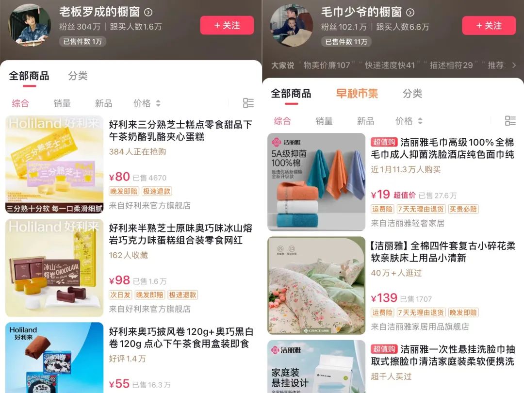 好利來二公子羅成通過“社恐老板”系列搞笑視頻走紅,潔麗雅三代繼承人石展承以“閑置少爺”與歸國二叔爭奪家業(yè)的短劇《毛巾帝國》爆火,兩人積累了足夠的粉絲后,都開始給自家產(chǎn)品帶貨,這也是推動(dòng)老牌企業(yè)年輕化轉(zhuǎn)型的策略之一。在抖音商品櫥窗,目前羅成掛了7件好利來產(chǎn)品,已售1w+,跟買數(shù)1.6w;石展承掛了14件潔麗雅產(chǎn)品,已售11w,跟買6.6w。