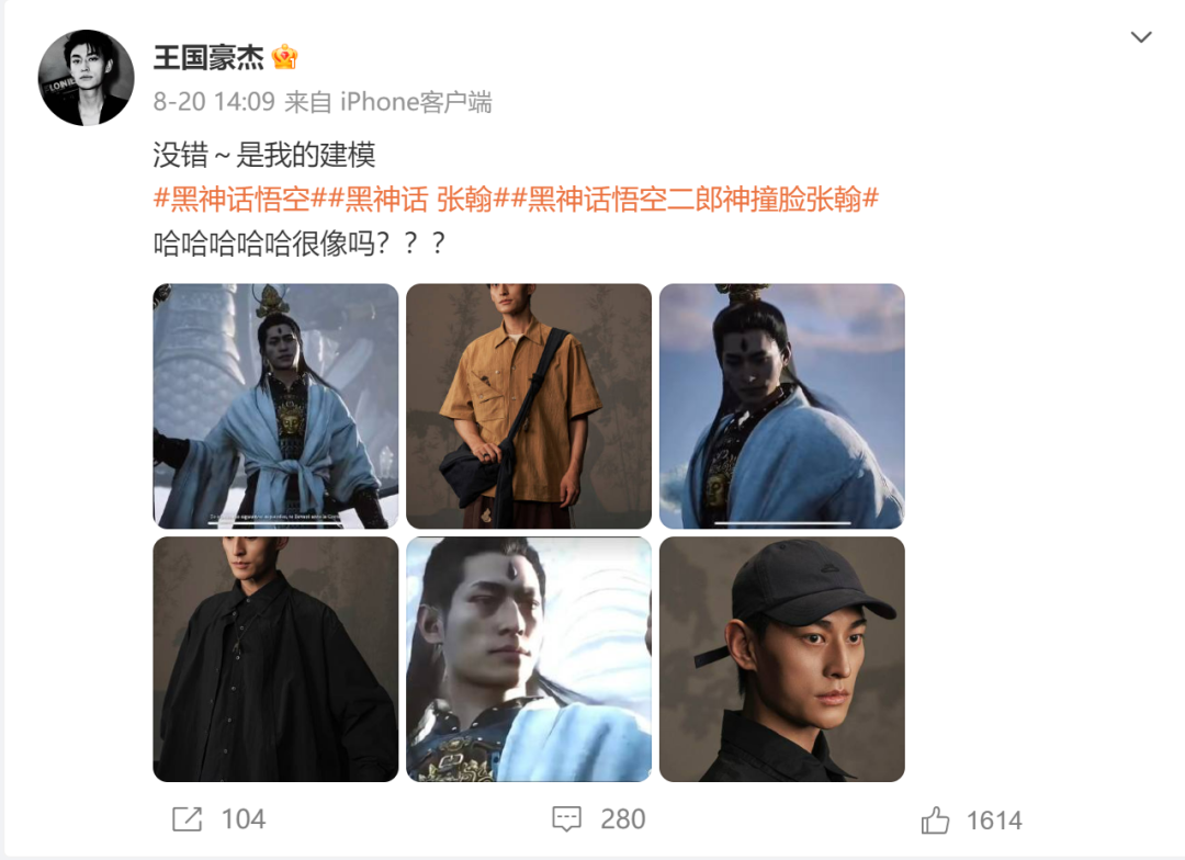 兩年之后,《黑神話:悟空》正式上線。王國(guó)豪杰才知道他在游戲里扮演的是二郎神楊戩,并沒(méi)有比普通玩家早很久。“黑神話悟空二郎神撞臉張翰”詞條登上微博熱搜,在詞條下,不少黑猴粉在給路人科普,“那不是張翰,是王國(guó)豪杰”,這也是王國(guó)豪杰第一次上熱搜。