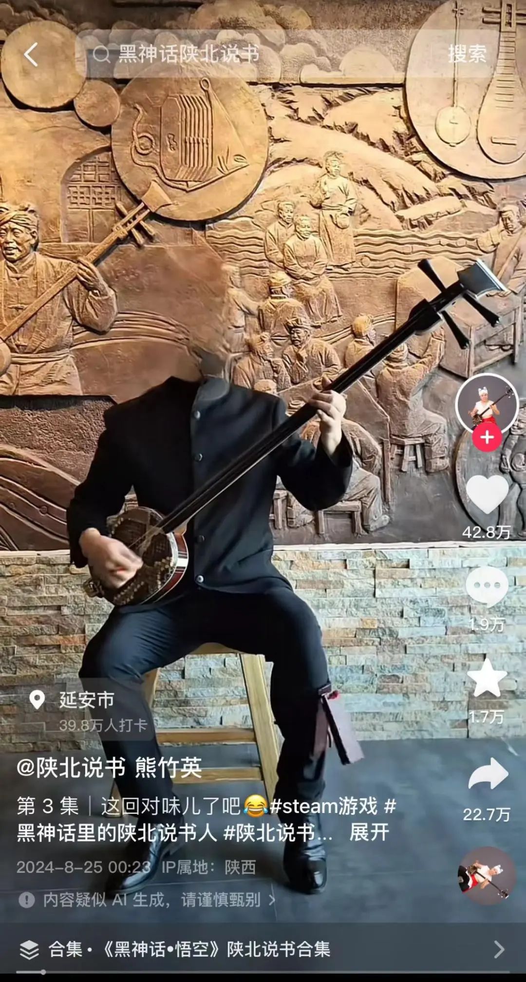 《黑神話:悟空》上線后,熊竹英的陜北說(shuō)書(shū)視頻獲得了大批玩家的點(diǎn)贊。抖音上最熱的一條視頻獲得了42.8萬(wàn)次點(diǎn)贊。熊竹英說(shuō),他希望能通過(guò)各種創(chuàng)新方式讓陜北說(shuō)書(shū)這一古老的藝術(shù)形式煥發(fā)出新的活力,走向全國(guó)?!逗谏裨挘何蚩铡穾椭龅搅诉@一點(diǎn)。