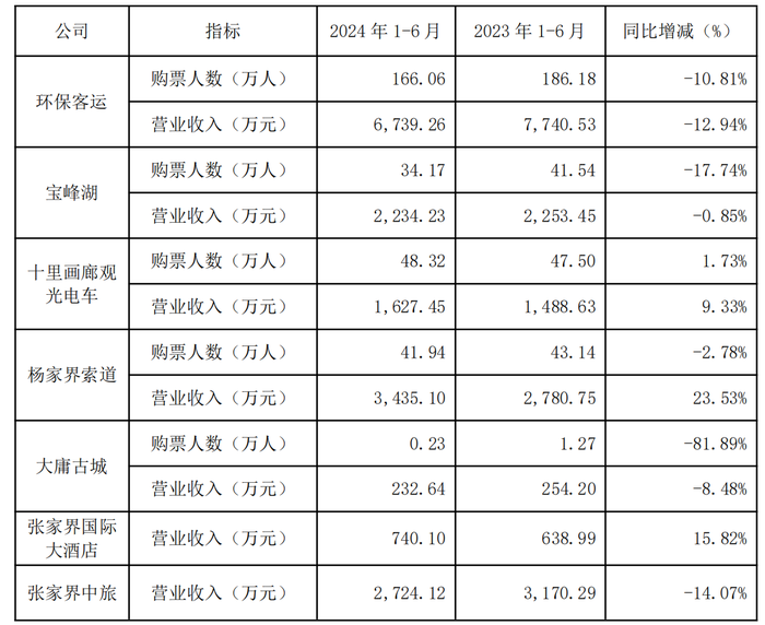 但高客流量下,張家界旗下7家主要成員公司能留住的客人并不多。僅十里畫廊觀光電車、張家界國際大酒店的營業(yè)收入同比取得增長,大庸古城、環(huán)??瓦\、寶峰湖、楊家界索道4家公司上半年購票人數(shù)以及張家界中旅營業(yè)收入分別下滑81.89%、10.81%、17.74%、2.78%和14.07%。