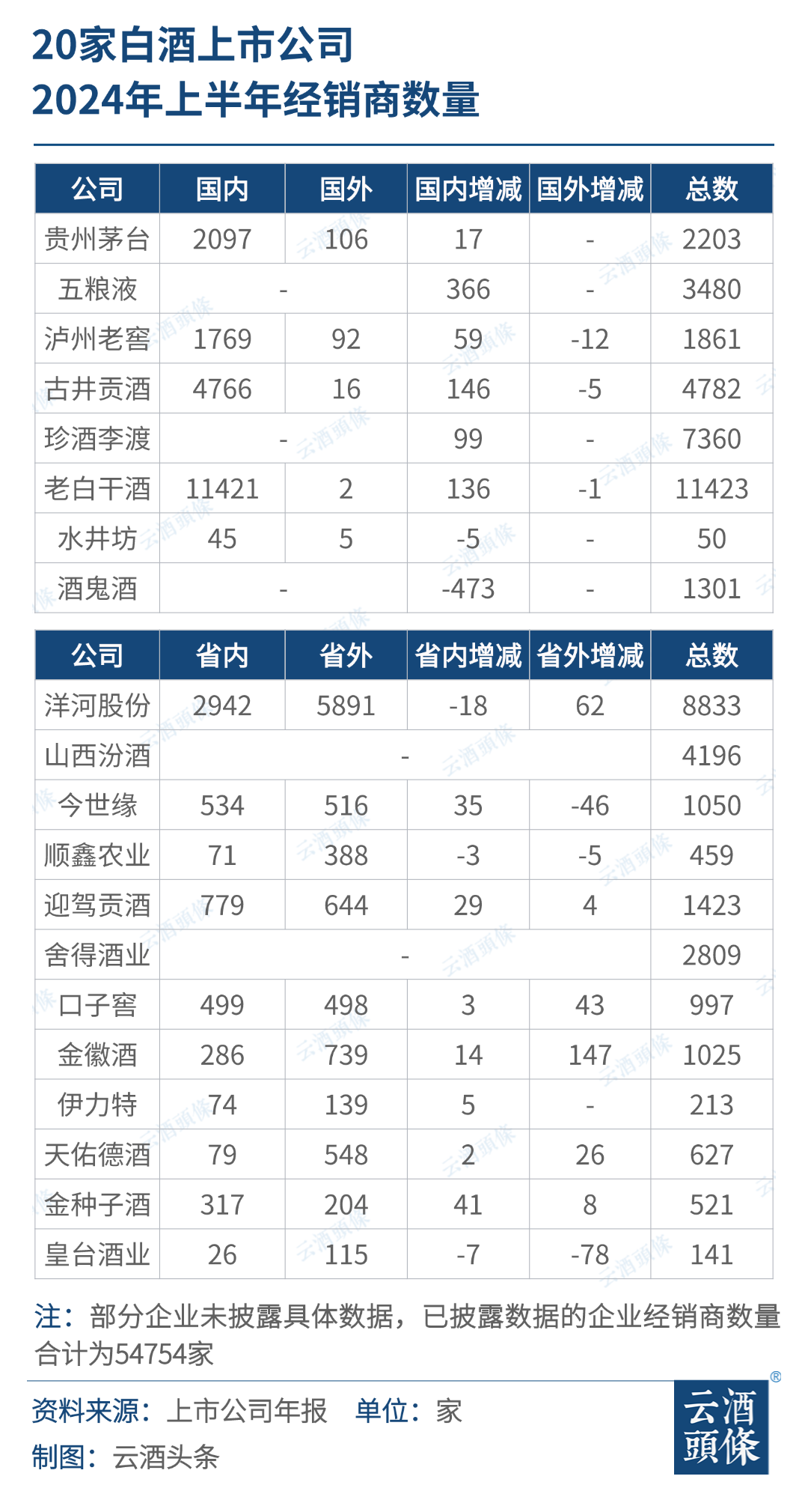 云酒頭條梳理發(fā)現(xiàn),今年上半年,20家白酒上市公司(巖石股份未披露)的經(jīng)銷商總數(shù)超過5.4萬家,同比增長2000家,擁有經(jīng)銷商數(shù)量最多的依然還是老白干酒,多達11423家。