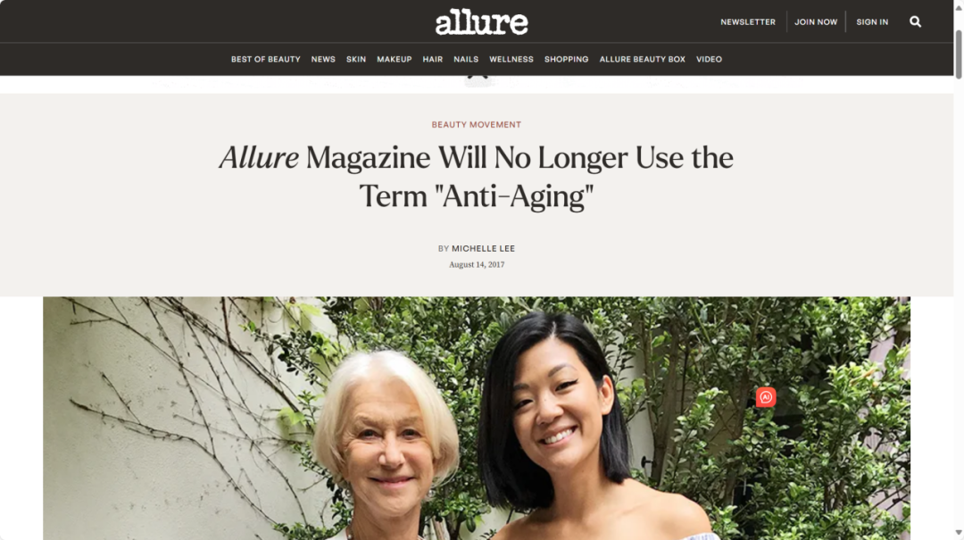 “具體來說,‘抗老’一詞是在2010年代末開始失寵,而當(dāng)美國最受歡迎的時尚美容雜志《Allure》于2017年宣布,將‘Anti-aging’這個詞從其版面上永久刪除后,這一趨勢被推向巔峰。時任主編米歇爾·李(Michelle Lee)在其編輯公開信中表示,她希望向美容行業(yè)的其他從業(yè)者發(fā)起挑戰(zhàn),呼吁他們也能這樣做。一時間,幾乎所有的美容品牌都‘諱言’抗老二字?!焙M鈺r尚財經(jīng)媒體《Business of Fashion》(下稱BoF)在其專欄中盤點道。