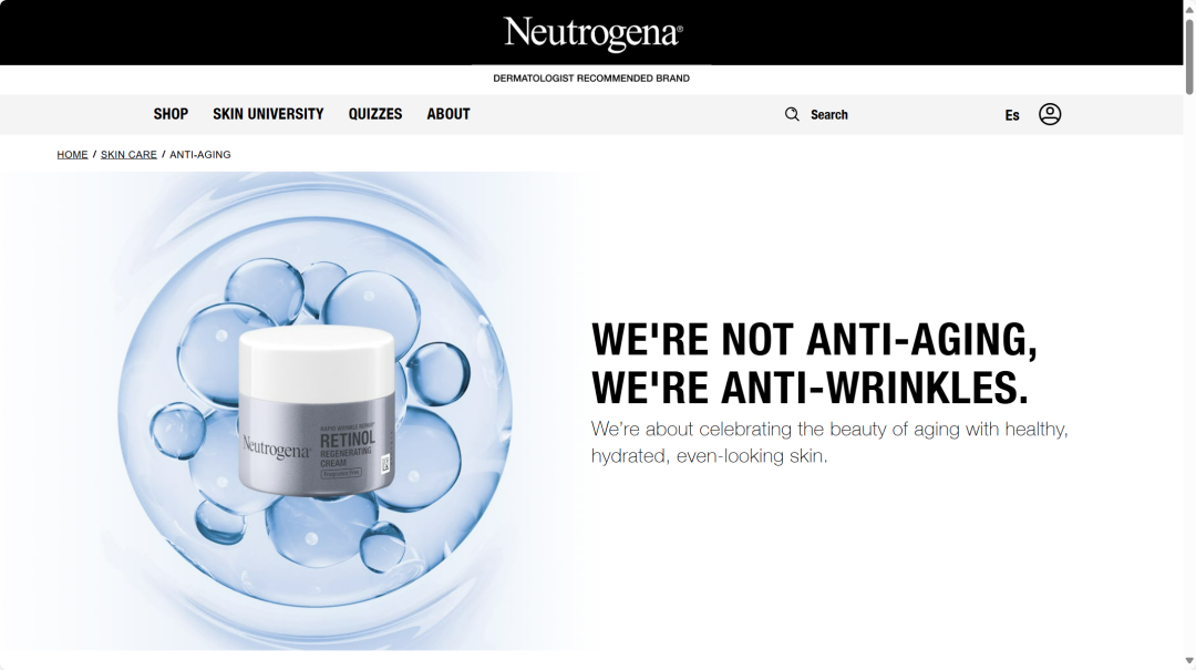“這是一個非常容易傳達信息的短語,直白地告訴消費者產(chǎn)品的用途。如果顧客不是美容愛好者,他們就會問,‘這是什么東西?它是抗衰老護理產(chǎn)品嗎?’你看,你根本避不開這個詞,這是顧客的訴求,那何必多此一舉?”她點評道,并諷刺過去的品牌稱,它們一方面試圖宣傳推銷具有抗老功效的產(chǎn)品,一方面又宣稱對衰老的概念持中立態(tài)度——甚至教育消費者要接受這一切。“這是一種瘋狂的雙重標準思想。”