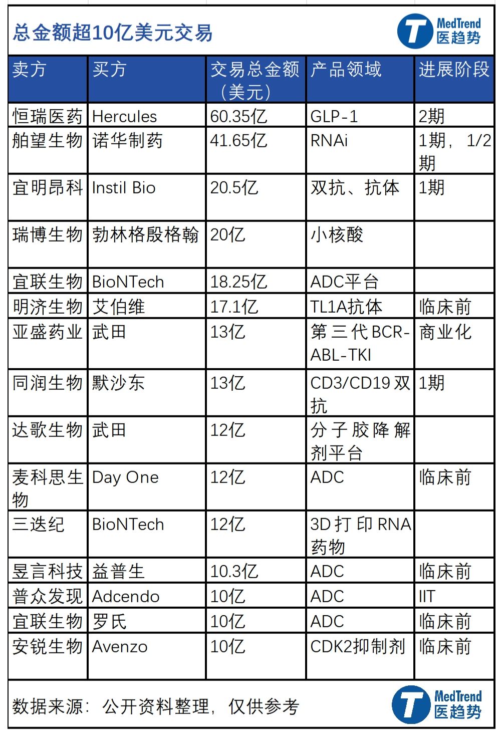 產(chǎn)品引入者包括跨國藥企以及生物技術(shù)公司,他們將目光投向中國,不僅關(guān)注產(chǎn)品交易,還推動對企業(yè)的收購。今年4月,丹麥生物技術(shù)公司Genmab以18億美元全現(xiàn)金收購普方生物,國內(nèi)第一家被收購的ADC公司也創(chuàng)下并購金額的記錄。