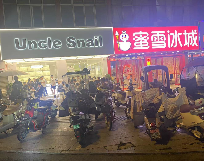 和新茶飲相對冷清、零食折扣店門店客流分化不同的是,部分業(yè)態(tài)在縣城仍迎來火爆。比如說,界首市一家名為Uncle Snail的螺螄粉門店當晚客流量火爆。中辣、特辣的螺螄粉,也直接帶動當晚門店旁蜜雪冰城需求的增長。