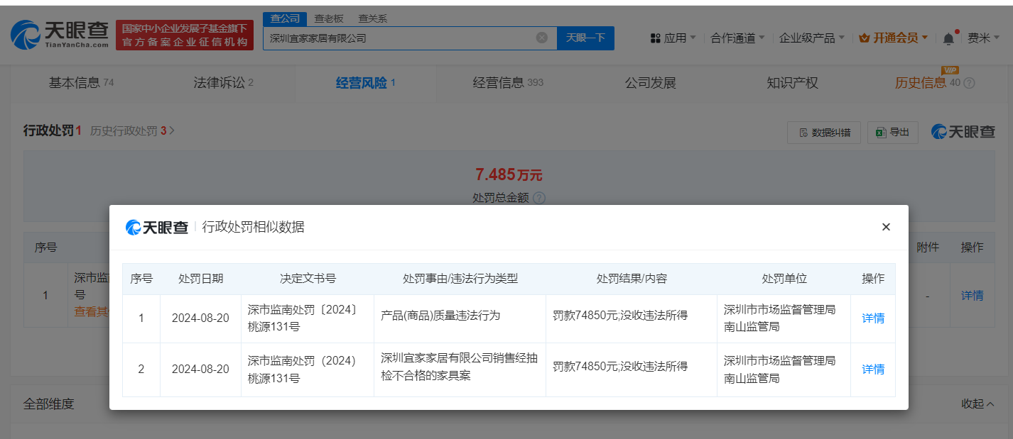 天眼查經(jīng)營風(fēng)險信息顯示,近日,深圳宜家家居有限公司因銷售經(jīng)抽檢不合格的家具,被深圳市市場監(jiān)督管理局南山監(jiān)管局罰款7.4萬余元。