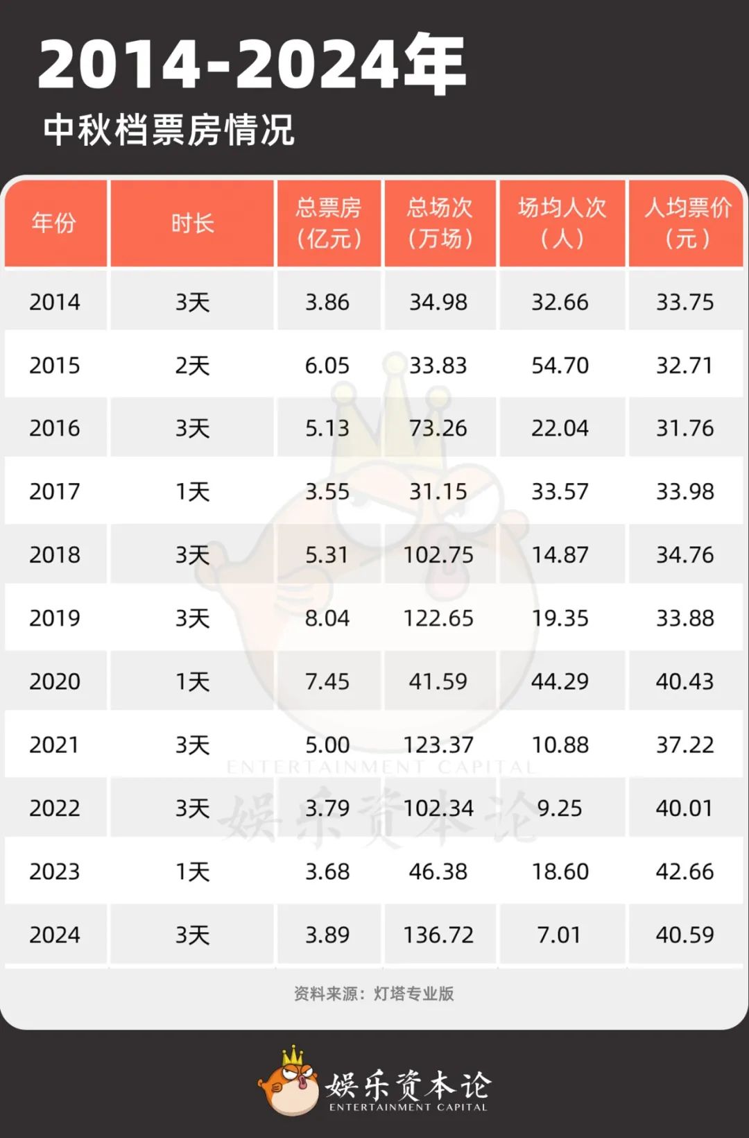 2014-2024中秋檔票房情況,數(shù)據(jù)來(lái)源:燈塔專(zhuān)業(yè)版。下同。