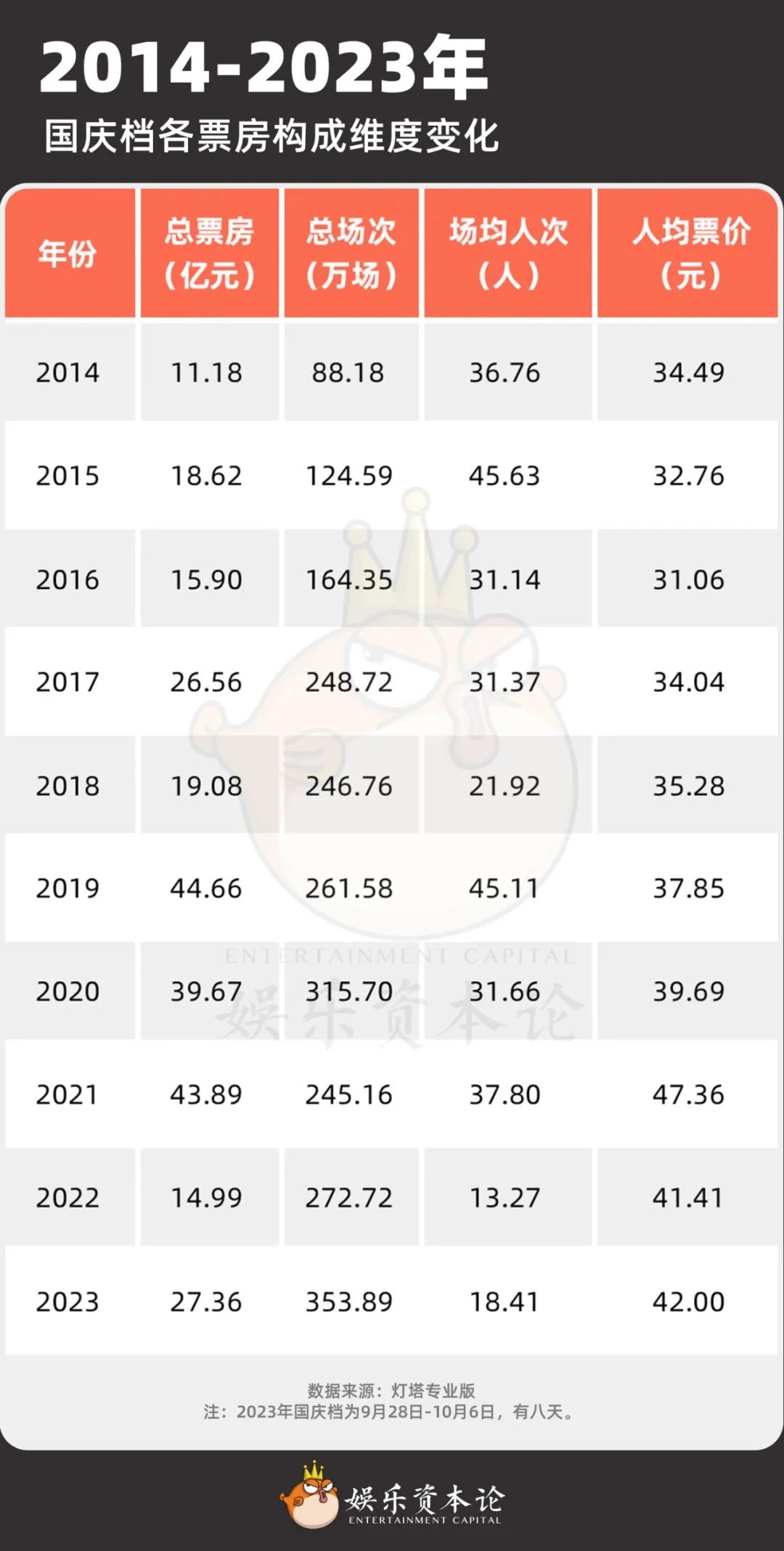 2014-2023年國(guó)慶檔整體情況,注:檔期票房?jī)H統(tǒng)計(jì)影片在國(guó)慶期間產(chǎn)生的票房。