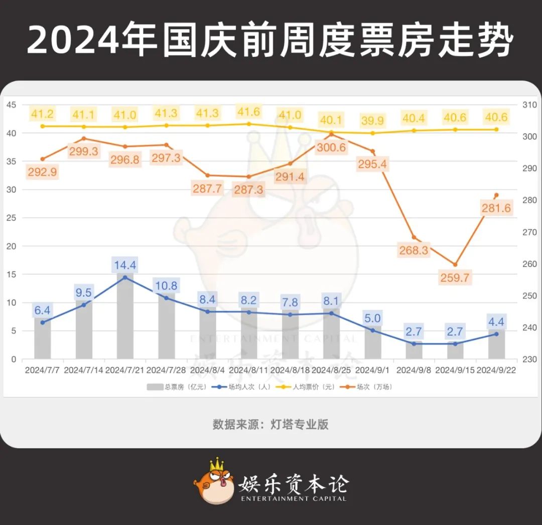 對(duì)比2023與2024年國(guó)慶前的票房走勢(shì),不難發(fā)現(xiàn):1)票價(jià)維度,今年的票價(jià)較去年下降1元左右,且節(jié)前3周平均票價(jià)維持不變,(中秋檔3日平均票價(jià)也為40.6元);
