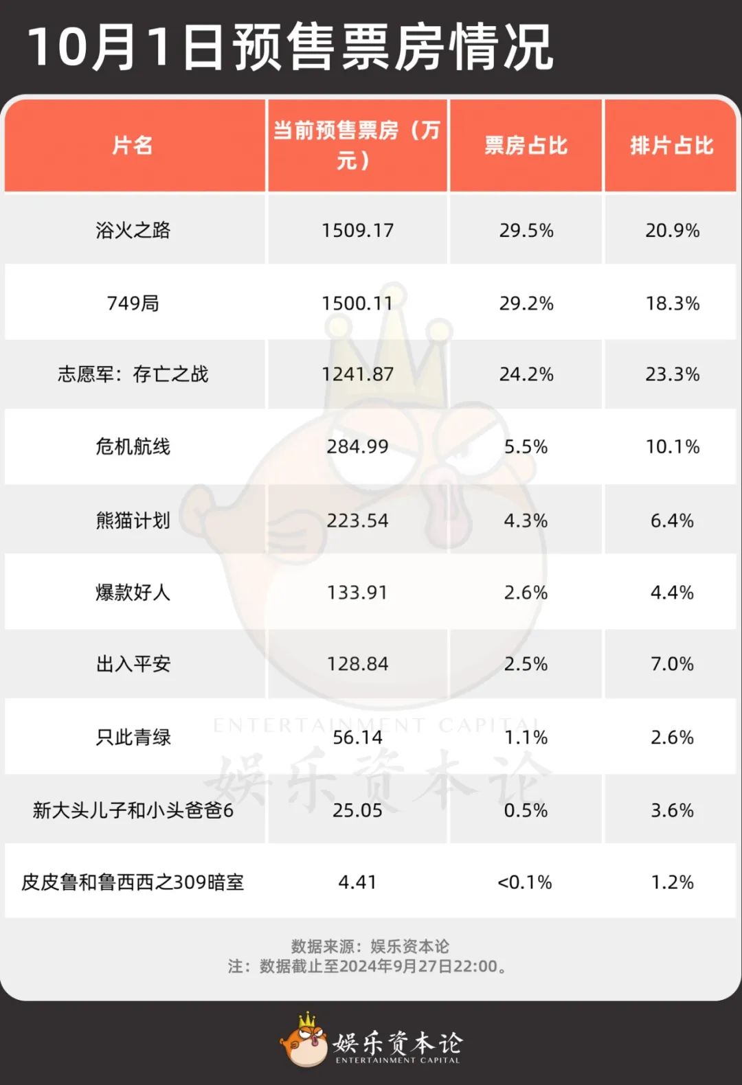 10月1日預(yù)售票房情況,注:數(shù)據(jù)截止至2024年9月27日22:00。