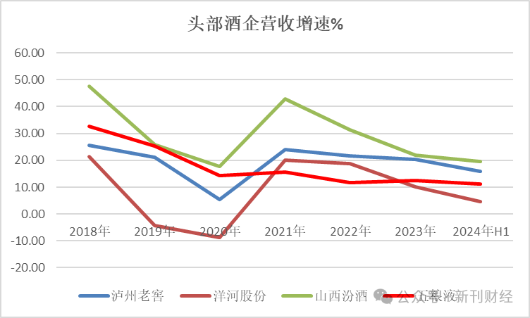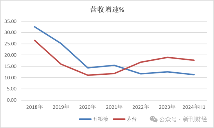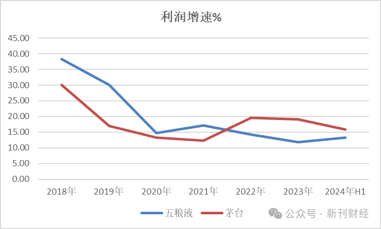 在這種經(jīng)營戰(zhàn)略下,五糧液近年來的業(yè)績增速呈現(xiàn)出放緩的趨勢。iFind數(shù)據(jù)顯示,五糧液2018年其營收和凈利潤增速分別高達32.61%和38.36%,彼時貴州茅臺的營收和凈利潤增速還僅為26.49%和30.00%,但是自2022開始貴州茅臺的營收和凈利潤增速便首次超越了五糧液,并在2023年和2024上半年一直領(lǐng)先五糧液,2024年,貴州茅臺營收和凈利潤增速分別領(lǐng)先五糧液6.46%和2.69%。