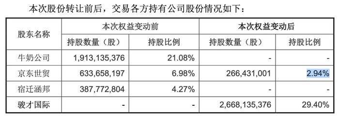 此次永輝超市股權(quán)的出讓方有三家,分別是牛奶公司、京東世貿(mào)和宿遷涵邦。其中牛奶公司出讓前持有永輝超市21.08%的股權(quán),京東世貿(mào)和宿遷涵邦為一致行動人,同屬于京東,出讓前分別持有永輝超市6.98%和4.27%的股權(quán),合計持股11.25%。