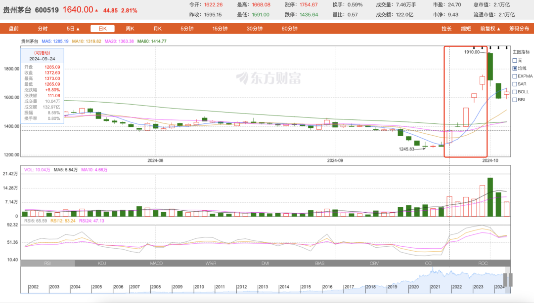 在此次行情中,頭部名酒公司強(qiáng)勢領(lǐng)漲,表現(xiàn)亮眼。在9月24日至9月30日的五個(gè)交易日內(nèi),貴州茅臺(tái)漲幅達(dá)38%,9月30日股價(jià)沖破1700元,總市值達(dá)2.2萬億元;五糧液和瀘州老窖分別實(shí)現(xiàn)45%和46%的漲幅;山西汾酒、瀘州老窖、古井貢酒、水井坊、舍得酒業(yè)等多只白酒股實(shí)現(xiàn)連續(xù)三個(gè)交易日漲停。一連串的強(qiáng)勢表現(xiàn)一度讓市場再提“白酒投資大年”話題。