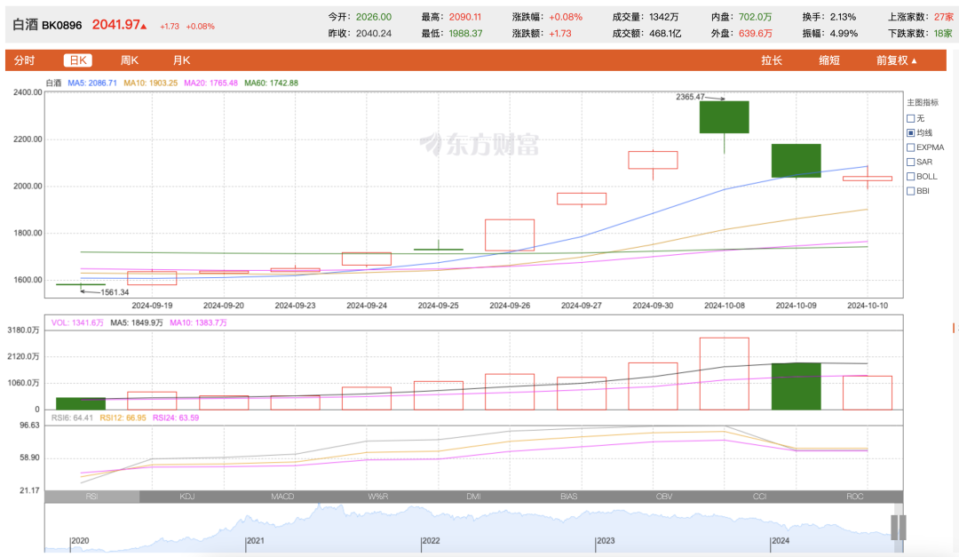 節(jié)后的巨大落差和節(jié)前的集體狂歡形成鮮明對比。時(shí)間來到國慶節(jié)前,白酒板塊剛剛回暖,經(jīng)歷了一波小牛市。9月30日15時(shí),A股白酒板塊以2150.40點(diǎn)收盤,當(dāng)時(shí)市場悲觀情緒散盡、信心顯著提升。