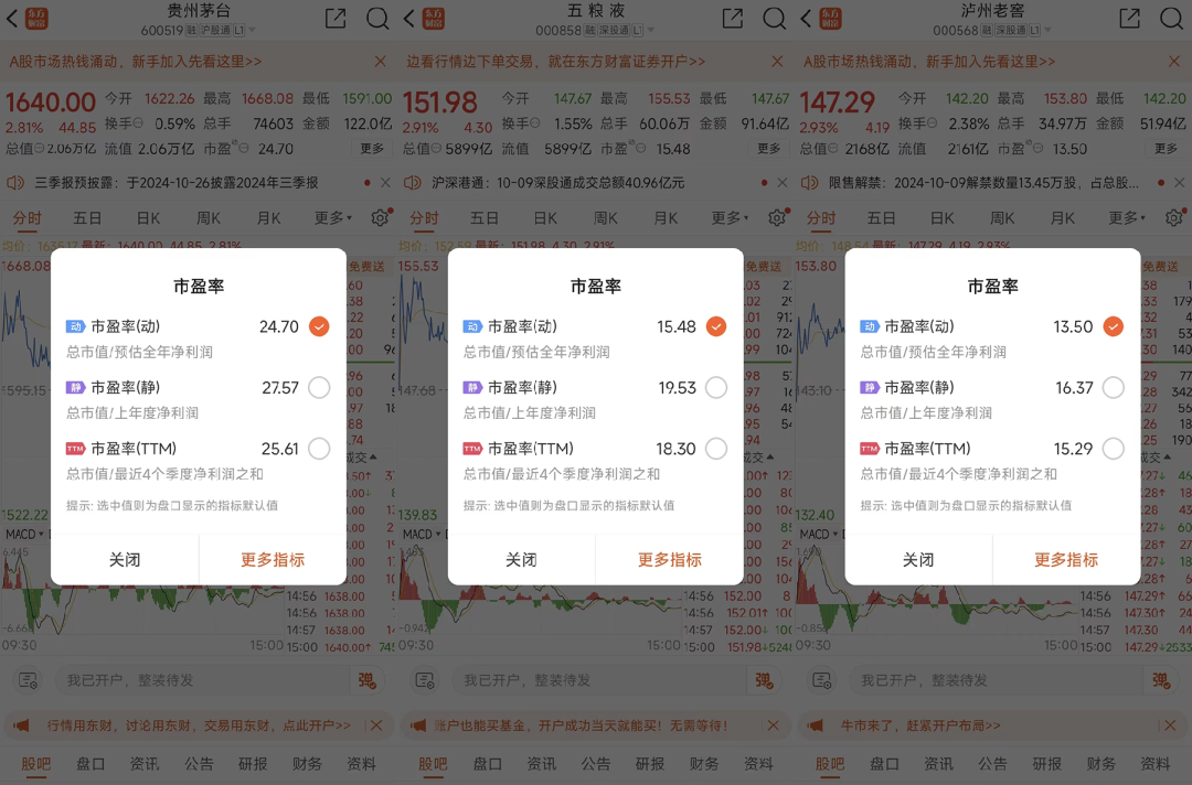 從市盈率層面看,10月10日,白酒板塊市盈率為21.7,其中貴州茅臺(tái)、五糧液、瀘州老窖市盈率分別為27.57、19.53、16.37。