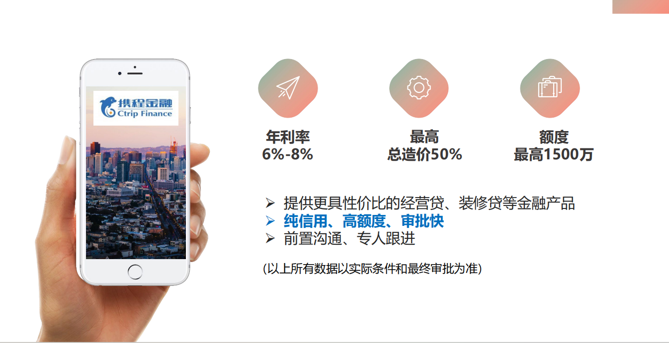 根據(jù)最新的宣傳信息是,攜程攜手益鴻程助力酒店換新,雙方推出“設(shè)計(jì)驅(qū)動(dòng),快裝輕改”的酒店換新產(chǎn)品。工期最短75天。攜程還能提供金融支持,額度最高1500萬(wàn),年利率在6%-8%之間。