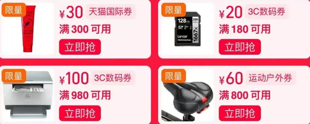 淘天則在3C、家電品類等京東優(yōu)勢項目上,發(fā)放滿980元減100元的“3C數(shù)碼券”、滿2980元減300元和滿5980元減600元的“家電超值券”等多個檔位優(yōu)惠。