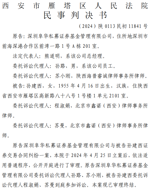 根據(jù)判決書,今年4月25日,原告深圳阜華私募證券基金管理有限公司(阜華冠宇量化3號(hào)私募證券投資基金的基金管理人,統(tǒng)稱為“阜華基金”)與被告孫建西證券交易合同糾紛一案已獲法院受理,目前已經(jīng)審理終結(jié)。