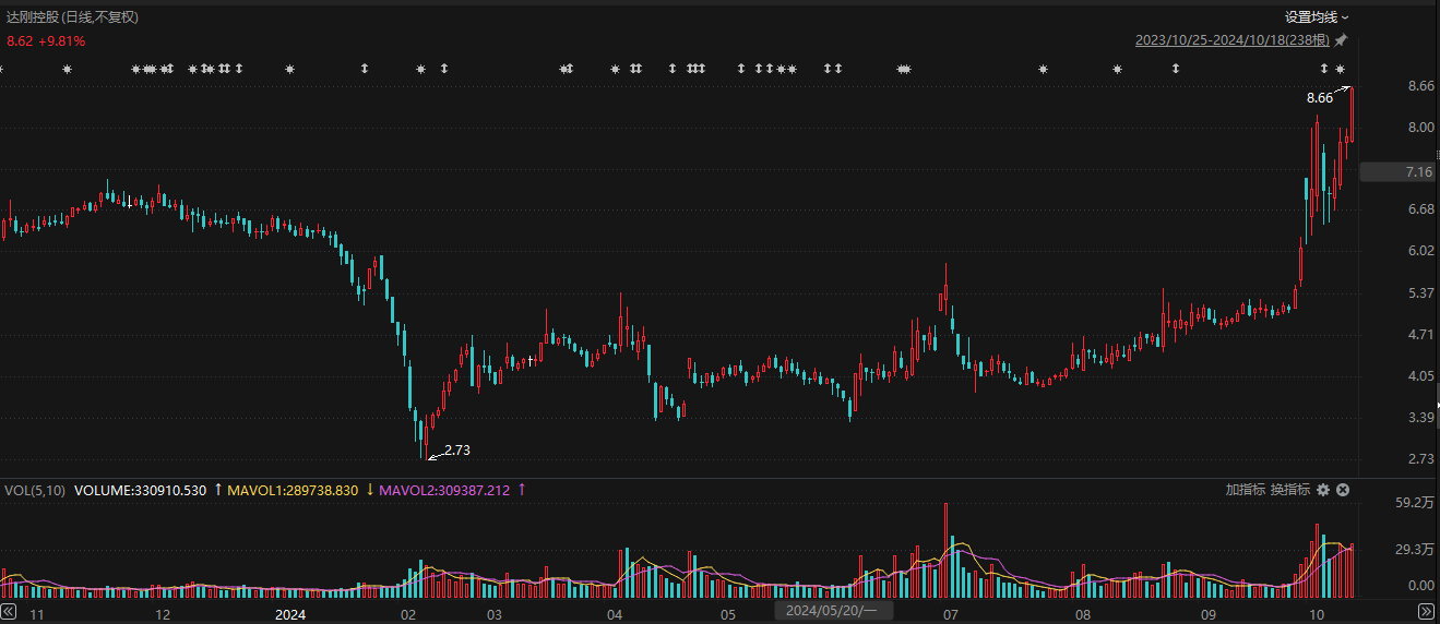 股價(jià)方面,2023年12月19日以來,達(dá)剛控股波動(dòng)劇烈。去年12月19日收盤價(jià)是6.49元/股,今年2月初一度跌至2.73元/股,10月18日又升至8.62元/股。