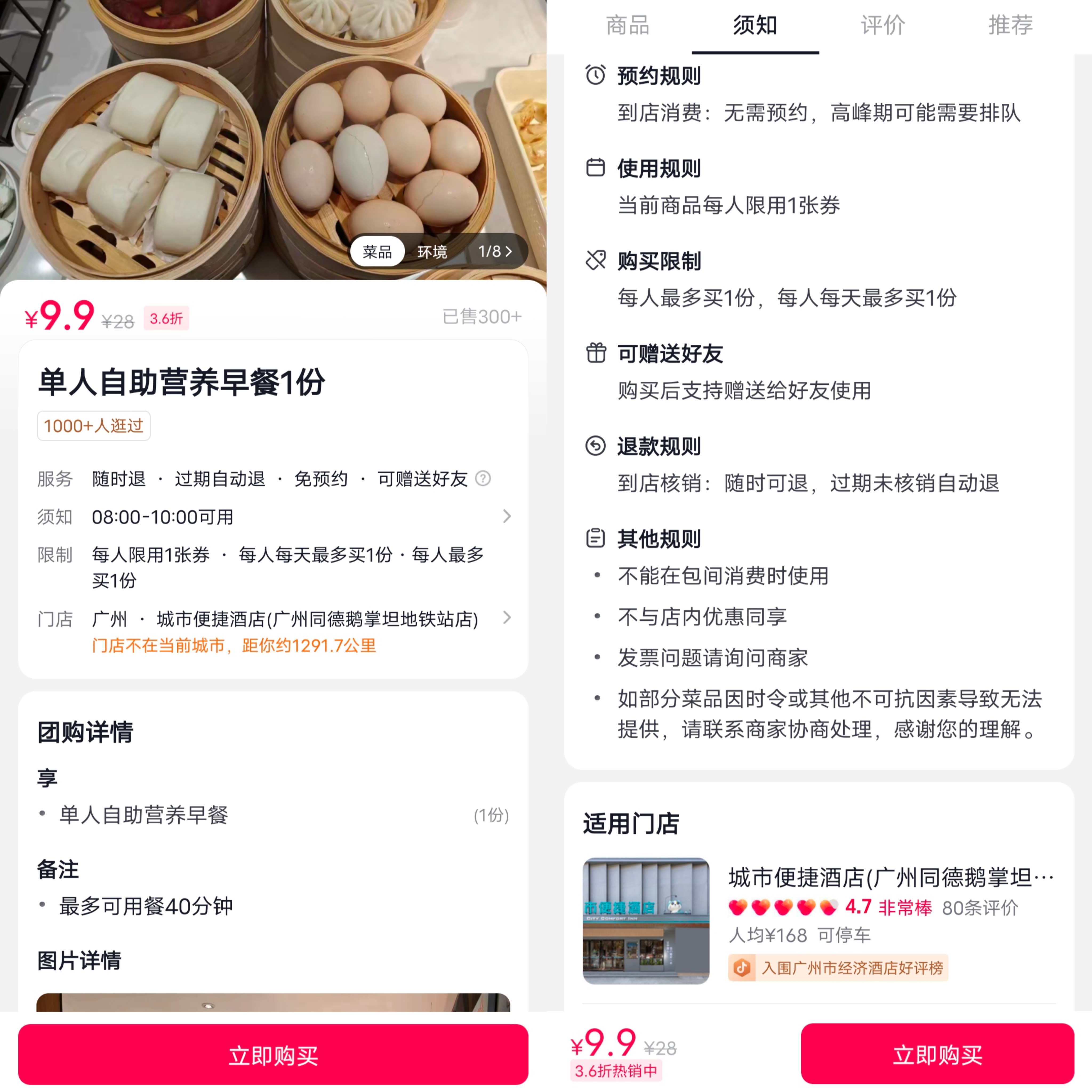 就以城市便捷酒店(廣州同德鵝掌坦地鐵站)為例,在美團(tuán)平臺(tái),其智能高級(jí)大床房的預(yù)計(jì)價(jià)格為311元(無(wú)早餐),而含2份早餐的預(yù)定價(jià)格為330元。折算下來(lái),每份早餐較單獨(dú)下單還要便宜一些。