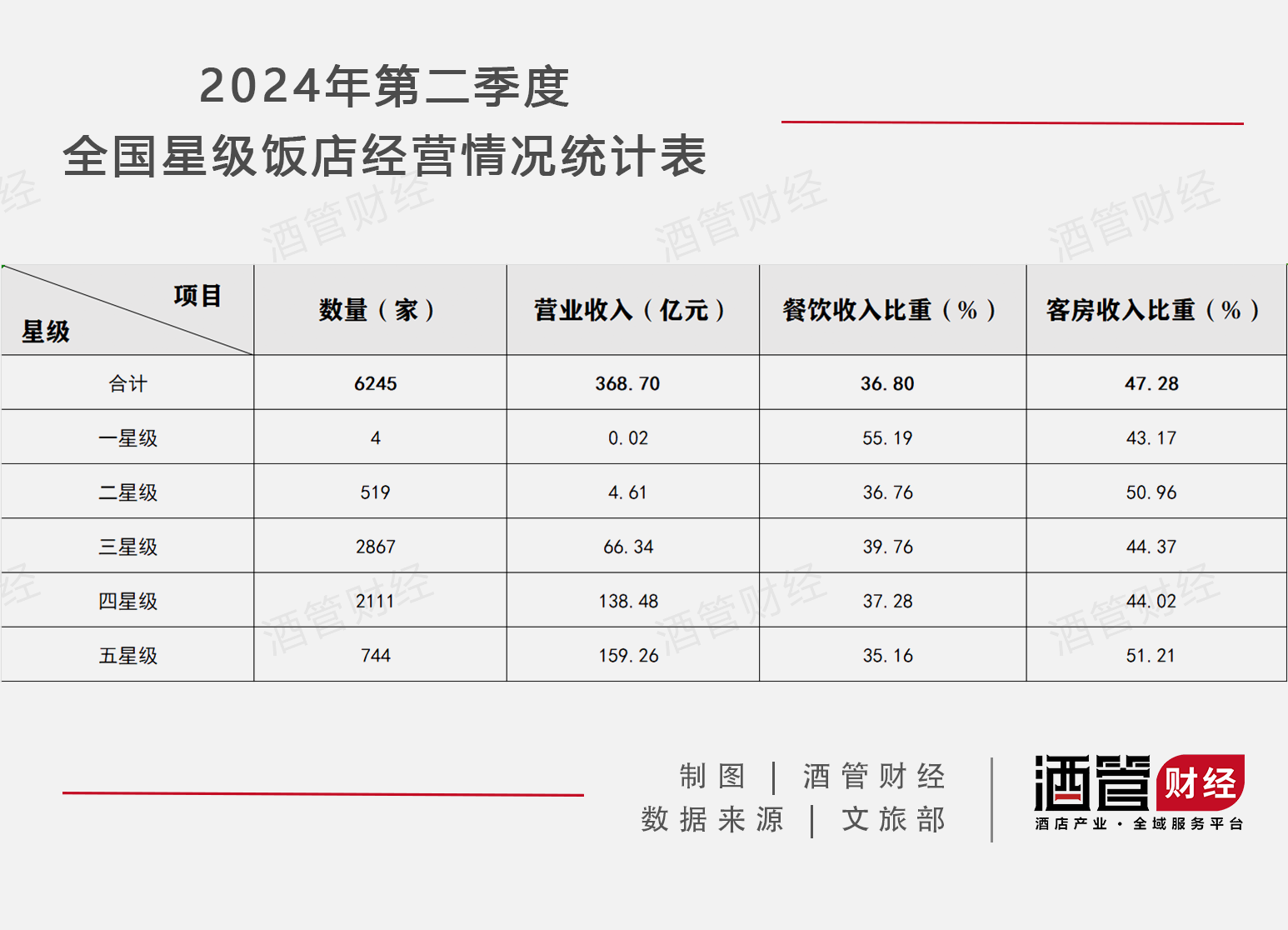 國(guó)家文旅部披露的數(shù)據(jù)顯示,2024年第二季度全國(guó)星級(jí)旅游飯店?duì)I業(yè)收入368.70億元,餐飲收入比重占36.80%。而對(duì)于一星、二星、三星級(jí)飯店,餐飲收入比重分別為55.19%、36.76%和39.76%。