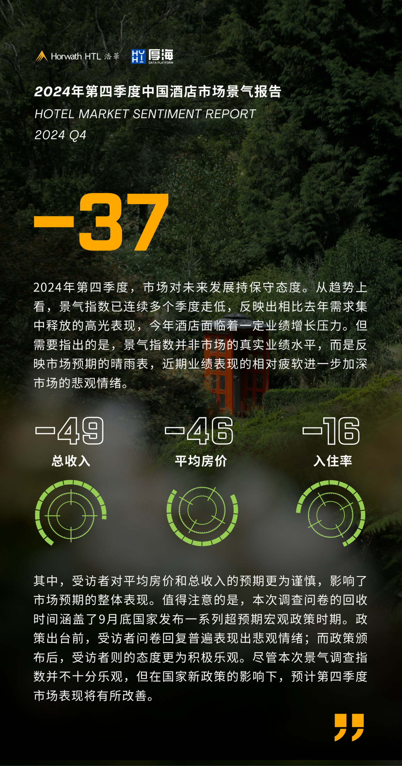 厚海數(shù)據(jù)平臺(tái)發(fā)布的《2024年第四季度中國(guó)酒店市場(chǎng)景氣報(bào)告》顯示,今年第四季度,市場(chǎng)對(duì)未來(lái)發(fā)展持保守態(tài)度。從趨勢(shì)講,景氣指數(shù)已經(jīng)連續(xù)多個(gè)季度走低,反映出相比去年需求集中釋放的高光表現(xiàn),今年酒店面臨著一定業(yè)績(jī)?cè)鲩L(zhǎng)壓力。