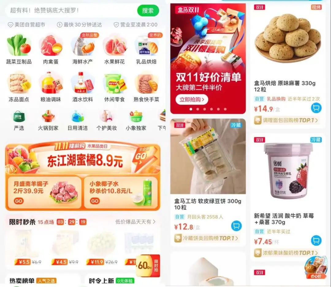 圖:雙11美團(tuán)APP小象超市入口頁面(左),雙11盒馬APP頁面(右) 來源:《聽筒Tech》截圖