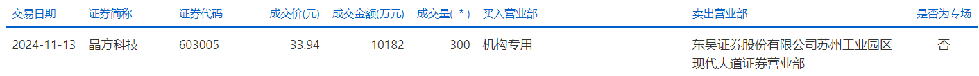 晶方科技11月13日大宗交易成交300萬股,成交額1.02億元,占當(dāng)日總成交額的1.36%,成交價(jià)33.94元,較市場收盤價(jià)34.49元折價(jià)1.59%。