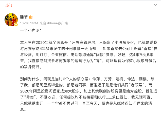 孟醒在微博上表示,“我成了“異類”,不受歡迎,任何提議均不被接受和執(zhí)行……求仁得仁,我無(wú)話可說,只能默默離開,一個(gè)字都不再過問?!泵闲逊Q,“本人早在2020年就全面離開了河貍家管理層,只保留了小股東身份?!?/p>