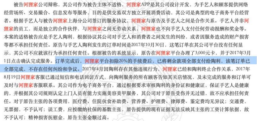 據(jù)一則相關(guān)裁判文書顯示,河貍家平臺(tái)上的一筆訂單完成后,平臺(tái)扣除20%手續(xù)費(fèi),剩余款項(xiàng)支付給手藝人。