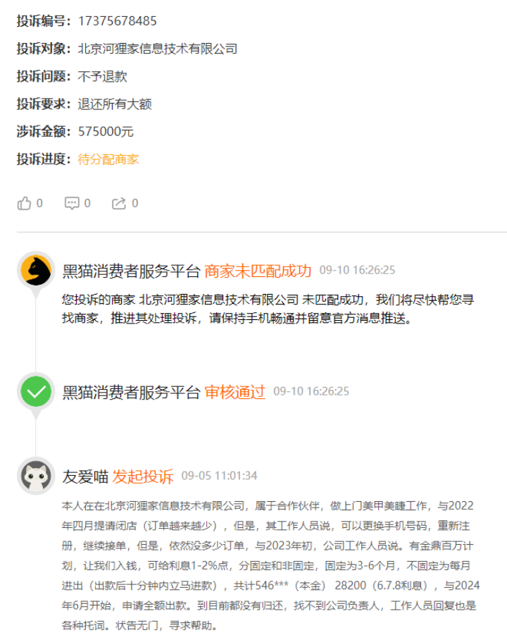 但在實(shí)際運(yùn)營(yíng)中,流量激勵(lì)漸漸變了味。據(jù)黑貓投訴上一位手藝人稱,其在河貍家做上門美甲美睫工作,因訂單量減少,在2022年4月申請(qǐng)閉店。但是河貍家工作人員表示“(公司)有金鼎百萬(wàn)計(jì)劃,投資可給利息1-2%,分固定和非固定,固定為3-6個(gè)月,不固定為每月進(jìn)出”。