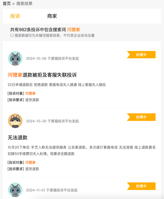 黑貓投訴顯示,河貍家有多達(dá)982條投訴,大多數(shù)為消費(fèi)者稱無(wú)法退款。主要集中于拒絕服務(wù)、拒絕退款;未消費(fèi)訂單申請(qǐng)退款卻遲遲未退;約不到手藝人;參與充值送現(xiàn)金活動(dòng)無(wú)法退款等。