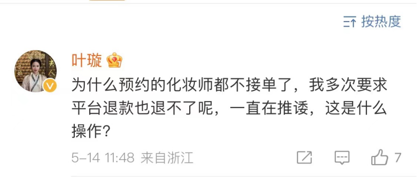 知名藝人葉璇也在微博上發(fā)聲,“為什么預(yù)約的化妝師都不接單了,多次要求平臺(tái)退款也退不了呢,一直在推諉……”