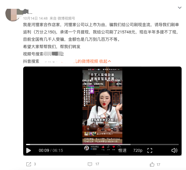 此次風(fēng)波也波及部分商家?!昂迂偧夜疽陨鲜袨橛?,騙我們給公司刷現(xiàn)金流,誘導(dǎo)我們刷單返利(萬(wàn)分之150),承諾一個(gè)月提現(xiàn),我給公司刷了215748元,現(xiàn)在不單是利息不給了,本金也不給我們了?!?/p>