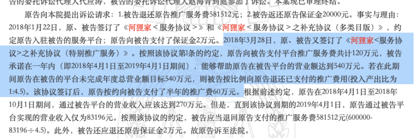 最終法院以河貍家承諾的半年?duì)I業(yè)額與合同約定的標(biāo)準(zhǔn)相距甚遠(yuǎn)等理由,判決河貍家退還重慶愛思特55.44萬(wàn)元推廣服務(wù)費(fèi)及2萬(wàn)元保證金。