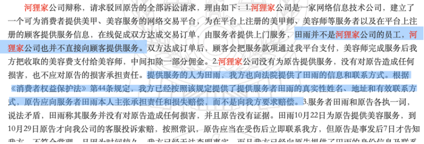 而河貍家以自身為網(wǎng)絡(luò)交易平臺(tái),與手藝人田某簽訂的是《服務(wù)協(xié)議》,田某并不是河貍家公司員工,河貍家并不直接向顧客提供服務(wù)為由,辯稱李某應(yīng)該向田某本人主張承擔(dān)責(zé)任和損失賠償。