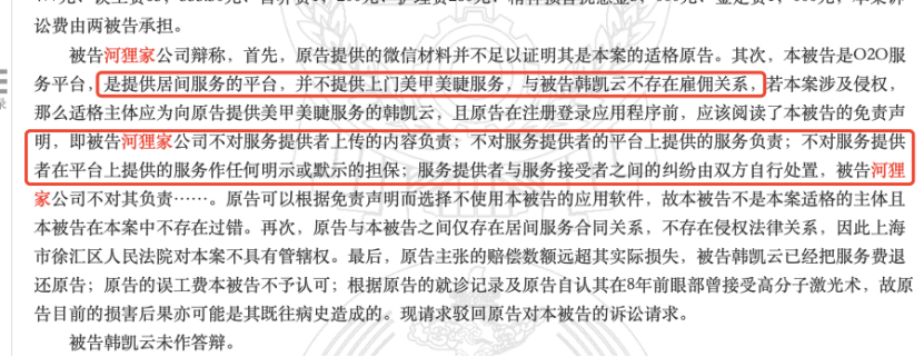 河貍家仍以其為提供居間服務(wù)的平臺(tái),與韓某不存在雇傭關(guān)系、且郭某在注冊(cè)河貍家APP時(shí),免責(zé)聲明中已提出河貍家不對(duì)服務(wù)提供者提供的服務(wù)負(fù)責(zé),消費(fèi)者和服務(wù)者雙方之間的糾紛自行處置等為由,拒絕對(duì)郭某進(jìn)行賠償。