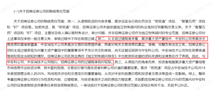 最終,中介機(jī)構(gòu)招商證券和瑞華會計(jì)師事務(wù)所(特殊普通合伙)也被追責(zé),其中,招商證券被罰沒6300萬元。同時(shí),法院認(rèn)定招商證券不存在與中安科、中安消技術(shù)惡意串通等明知或應(yīng)當(dāng)明知的情況,最終判定招商證券在25%的范圍內(nèi)對投資者承擔(dān)連帶賠償責(zé)任。