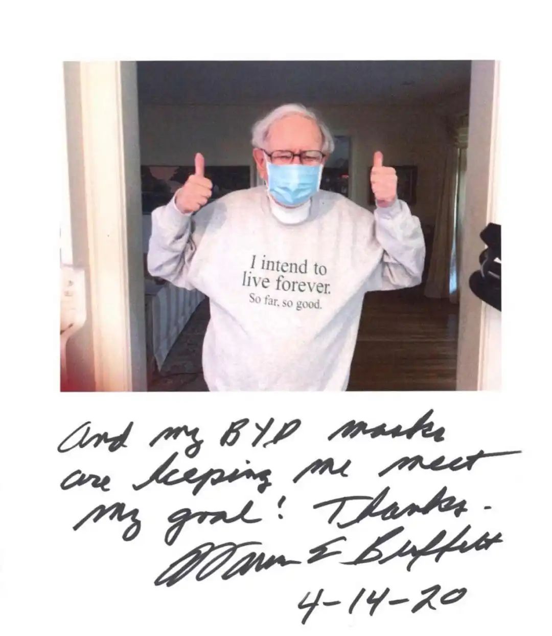 比亞迪的大股東“股神”巴菲特還在社交平臺曬出一張他佩戴比亞迪生產(chǎn)的口罩的照片。巴菲特的T恤上面印著“我想長命百歲,目前為止還不錯”,他還在照片下面寫道:“現(xiàn)在,我的比亞迪口罩正幫助我實現(xiàn)這個目標?!?/p>