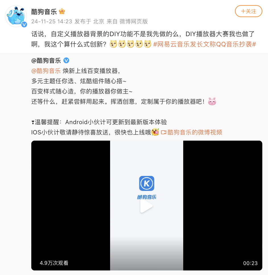 11月25日,網(wǎng)易云音樂發(fā)長圖指責(zé)QQ音樂抄襲,其中舉例指出后者在11月23日版本更新中新增的播放器自定義功能與網(wǎng)易云音樂在10月25日上線的音樂播放器DIY功能極為相似。隨后,酷狗音樂發(fā)文表示:“自定義播放器背景的DIY功能不是我先做的么,DIY播放器大賽我也做了啊,我這個算什么式創(chuàng)新?”酷狗音樂還附了2023年10月發(fā)布的關(guān)于介紹自定義播放器的視頻。據(jù)了解,QQ音樂和酷狗音樂同屬騰訊音樂娛樂集團(tuán)旗下。