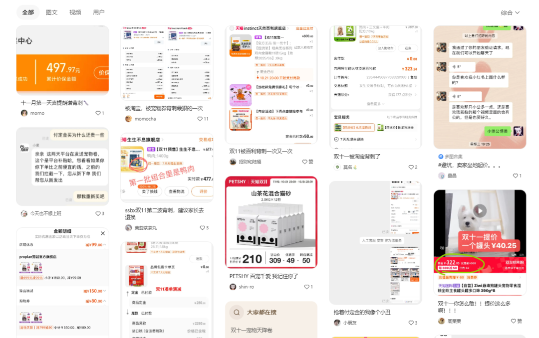 各種大促不僅是品牌方的重要節(jié)點(diǎn),同樣也有不少鏟屎官們在這期間做功課,穿梭各平臺 “做功課”。在小紅書搜 “性價(jià)比高的貓砂”,看真實(shí)用戶使用心得、優(yōu)缺點(diǎn)對比;在養(yǎng)寵貼關(guān)注 “老年寵物保健品推薦”,汲取經(jīng)驗(yàn)分享;逛淘寶、京東,比對各品牌產(chǎn)品詳情、買家評價(jià),篩選出意向清單。