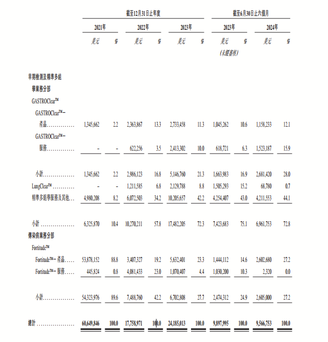從收入結(jié)構(gòu)看,包括胃癌早篩產(chǎn)品GASTROClear 和肺癌早篩產(chǎn)品LungClear 在內(nèi)的“早期檢測及精準(zhǔn)多組學(xué)服務(wù)”業(yè)務(wù),也是覓瑞的營收主力,2023年占比高達(dá)72.3%。