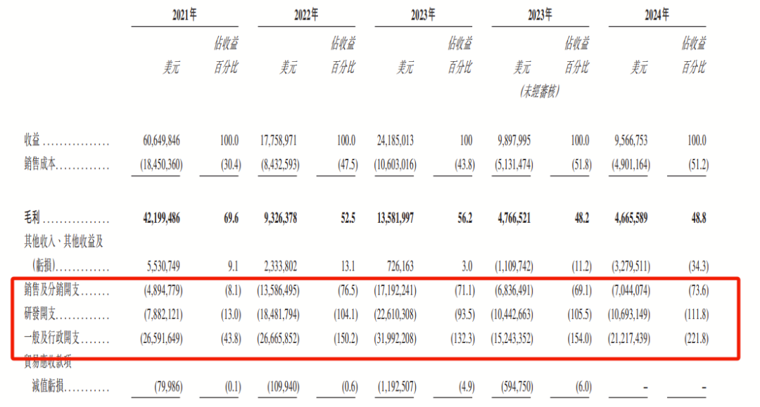 包括研發(fā)等在內(nèi)的支出,也給覓瑞的財務(wù)造成了一定壓力。《招股書》顯示,2023年,公司銷售與分銷、研發(fā),以及一般與行政開支三大項(xiàng)總額達(dá)到了7179.48萬美元,占總營收的比例為297%。換句話說,公司的支出幾乎是收入的三倍。