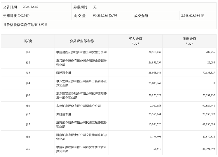 12月16日,光華科技今日跌停,龍虎榜數(shù)據(jù)顯示,上榜營業(yè)部席位全天成交4.9億元,占當(dāng)日總成交金額比例為21.8%。其中,買入金額為1.59億元,賣出金額為3.31億元,合計(jì)凈賣出1.72億元。