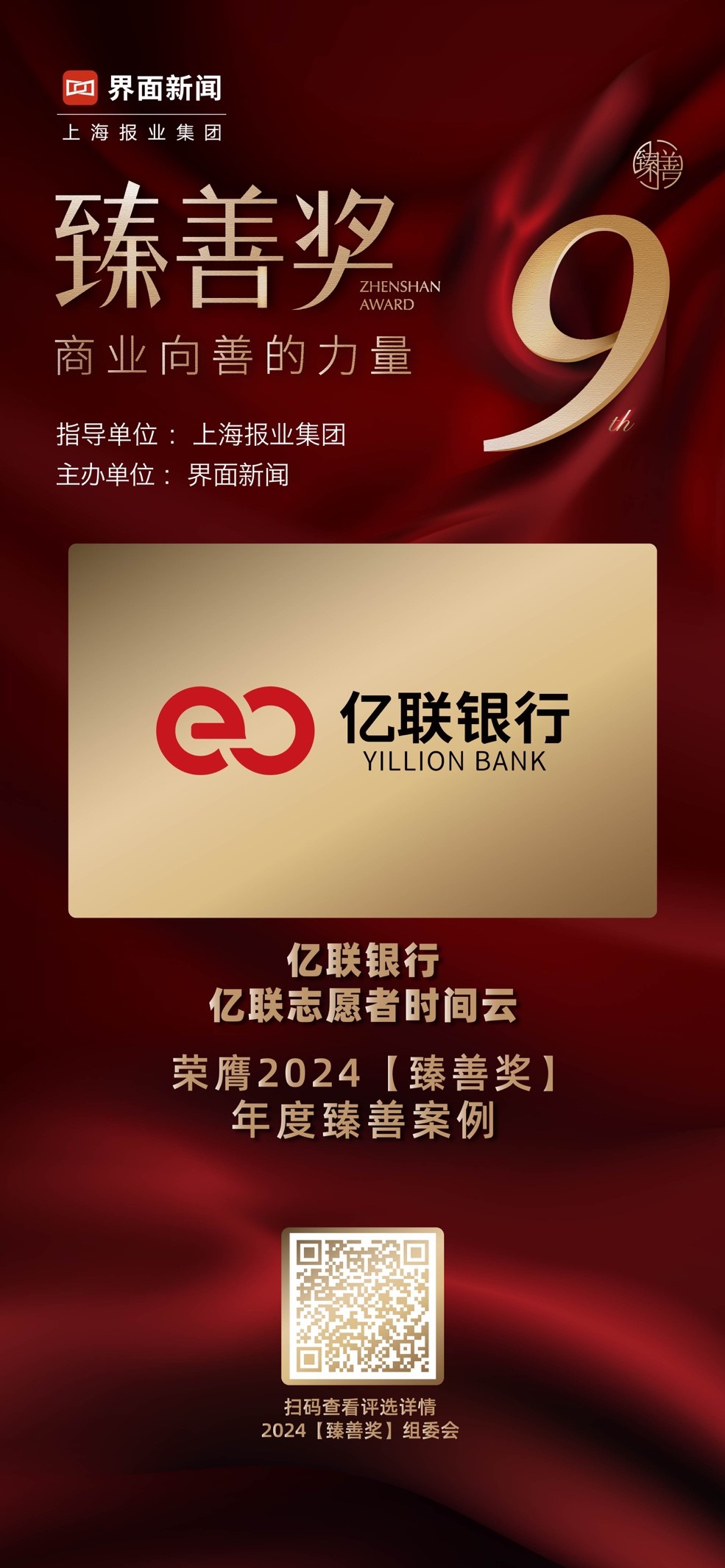 12月18日,上海報業(yè)集團 | 界面新聞在上海世博創(chuàng)意秀場舉辦了2024【臻善獎】頒獎典禮,并正式公布了本年度獲獎名單。聚“商業(yè)向善”之力,本屆【臻善獎】吸引了一大批在公益慈善領(lǐng)域有所貢獻(xiàn)的優(yōu)秀企業(yè)和公益人士參與。億聯(lián)銀行憑借“億聯(lián)志愿者時間云”項目榮膺年度臻善案例。