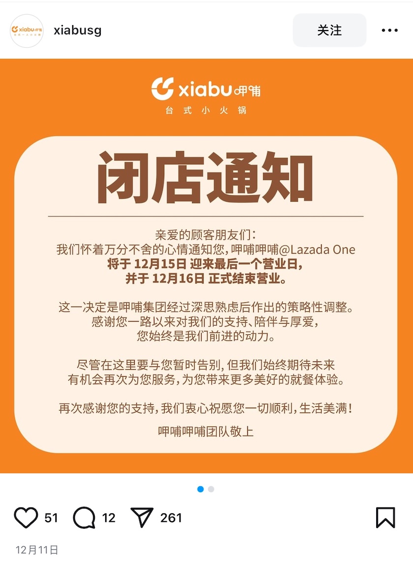 呷哺呷哺在新加坡的唯一一家門店在12月16日正式停業(yè)。