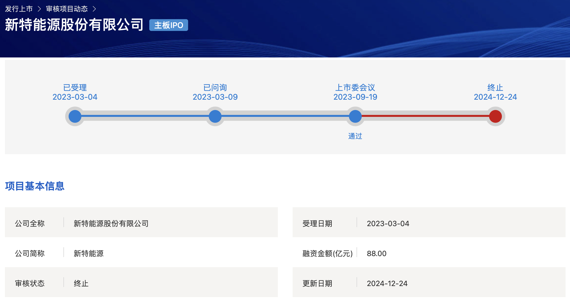 上交所官網(wǎng)信息顯示,新特能源最后一次更新上市動態(tài),是去年12月7日發(fā)布相關(guān)審核問詢函回復(fù)內(nèi)容,此后無更多動態(tài),直至如今IPO終止。