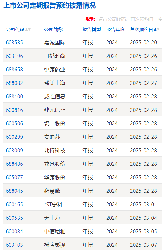 12月26日,上交所上市公司2024年年報(bào)預(yù)約披露時(shí)間出爐,嘉誠(chéng)國(guó)際拔得頭籌,將于2025年2月20日率先披露;日播時(shí)尚、悅康藥業(yè)將于2月26日披露。