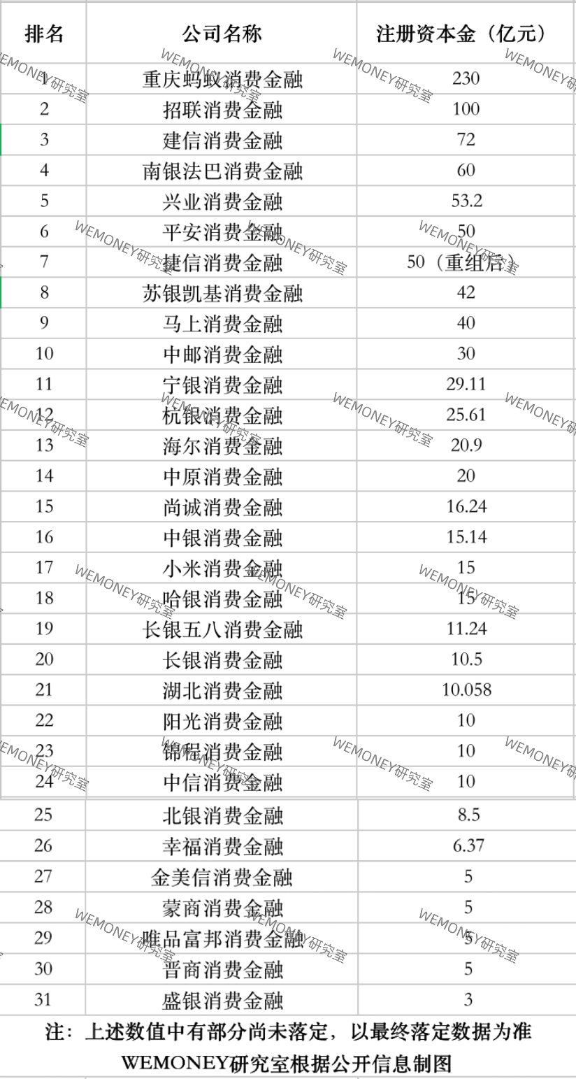 隨著新一輪增資布局,消費(fèi)金融公司注冊(cè)資本排名重新洗牌。經(jīng)WEMONEY研究室統(tǒng)計(jì),截至2024年末,注冊(cè)資本金排名前十的消費(fèi)金融公司分別為:螞蟻消費(fèi)金融230億,招聯(lián)消費(fèi)金融100億,建信消費(fèi)金融72億,南銀法巴消費(fèi)金融60億,興業(yè)消費(fèi)金融53.2億元,平安消費(fèi)金融50億元,(重組后)捷信消費(fèi)金融50億元,蘇銀凱基消費(fèi)金融42億元,馬上消費(fèi)金融40億元,中郵消費(fèi)金融30億元。